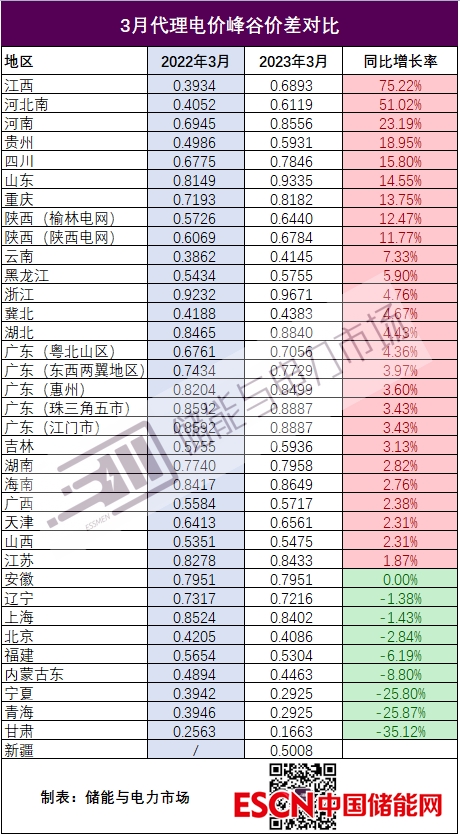 江西、河北南峰谷價差同比增長超過50%。江西同比增幅最大為75.22%;