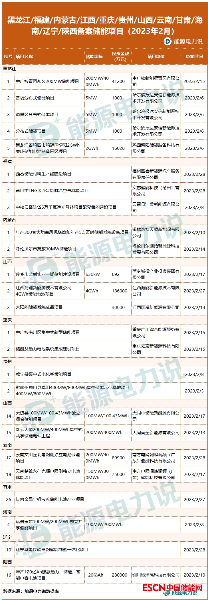 2月,黑龍江、福建、內(nèi)蒙古、江西、重慶、貴州等多省均有備案儲能項目。