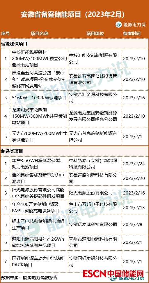 2月,安徽省備案儲能項目12個。其中儲能建設(shè)項目5個3個獨立共享儲能項目,總規(guī)模450MW/900MWh;儲能產(chǎn)品制造項目7個,涉及鋰電池電芯、電池模組、PACK、BMS、儲能電池關(guān)鍵部件、超低溫儲能電池等儲能產(chǎn)業(yè)鏈產(chǎn)品制造。