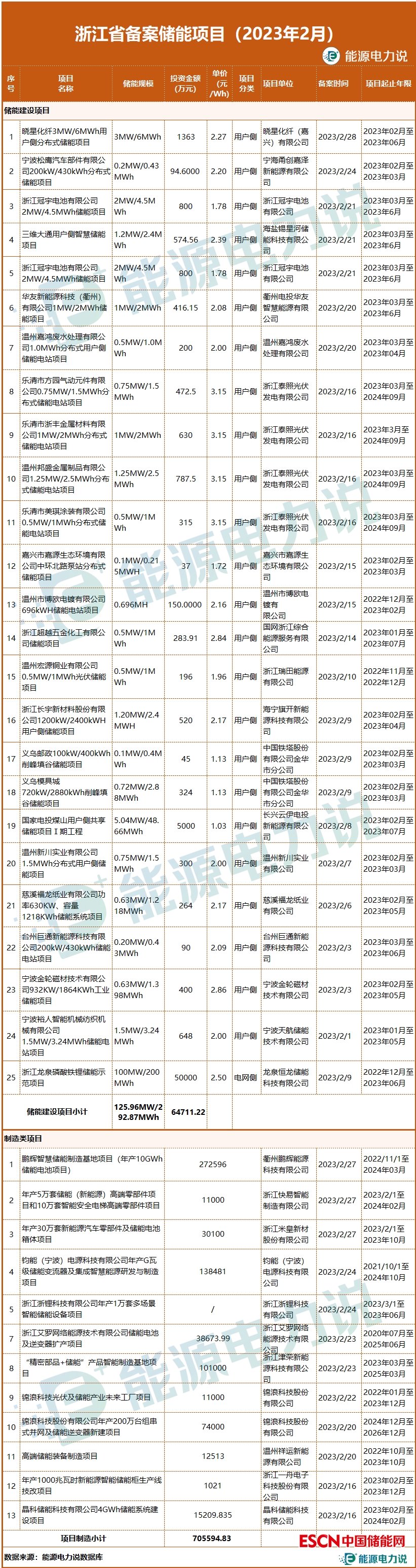 2月,浙江省備案儲能項目39個,其中儲能建設(shè)項目25個,總規(guī)模約126MW/292.9MWh,總投資金額約6.5億元,以工商業(yè)用戶側(cè)儲能項目為主;儲能產(chǎn)品制造類項目14個,總投資金額約70.6億元,涉及儲能電池、儲能系統(tǒng)、組串式PCS、儲能電池箱體等儲能產(chǎn)業(yè)鏈產(chǎn)品制造。