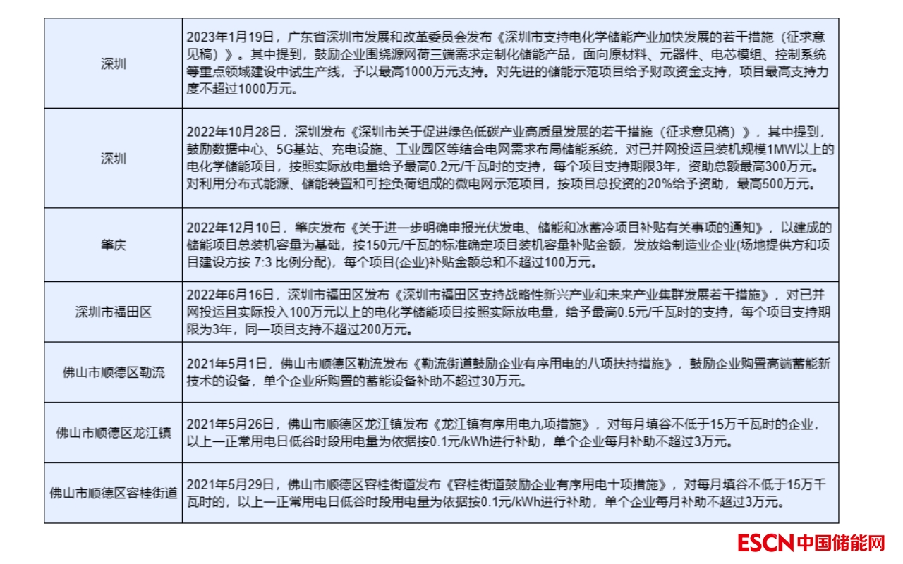 儲能補貼方面,深圳、佛山、肇慶等城市已相繼出臺多項鼓勵政策,其中,深圳儲能項目最高補貼可達1000萬元,肇慶每個項目補貼不超過100萬元。