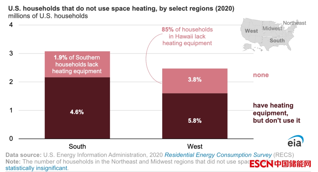 中國儲能網(wǎng)訊:根據(jù)美國能源信息署的最新的住宅能耗調(diào)查,2020年近5%的美國家庭(580萬戶)沒有使用任何房屋供暖設(shè)備,如天然氣爐、電加熱器和木材燃燒爐。