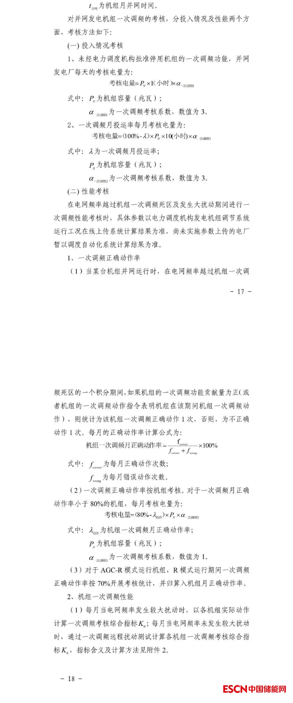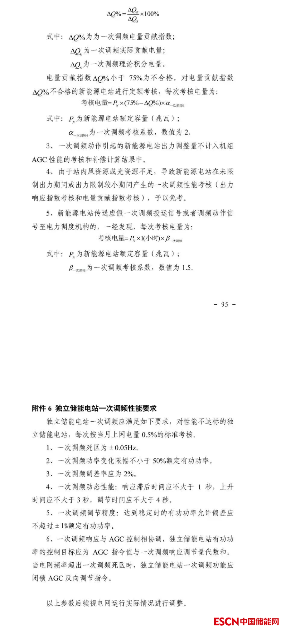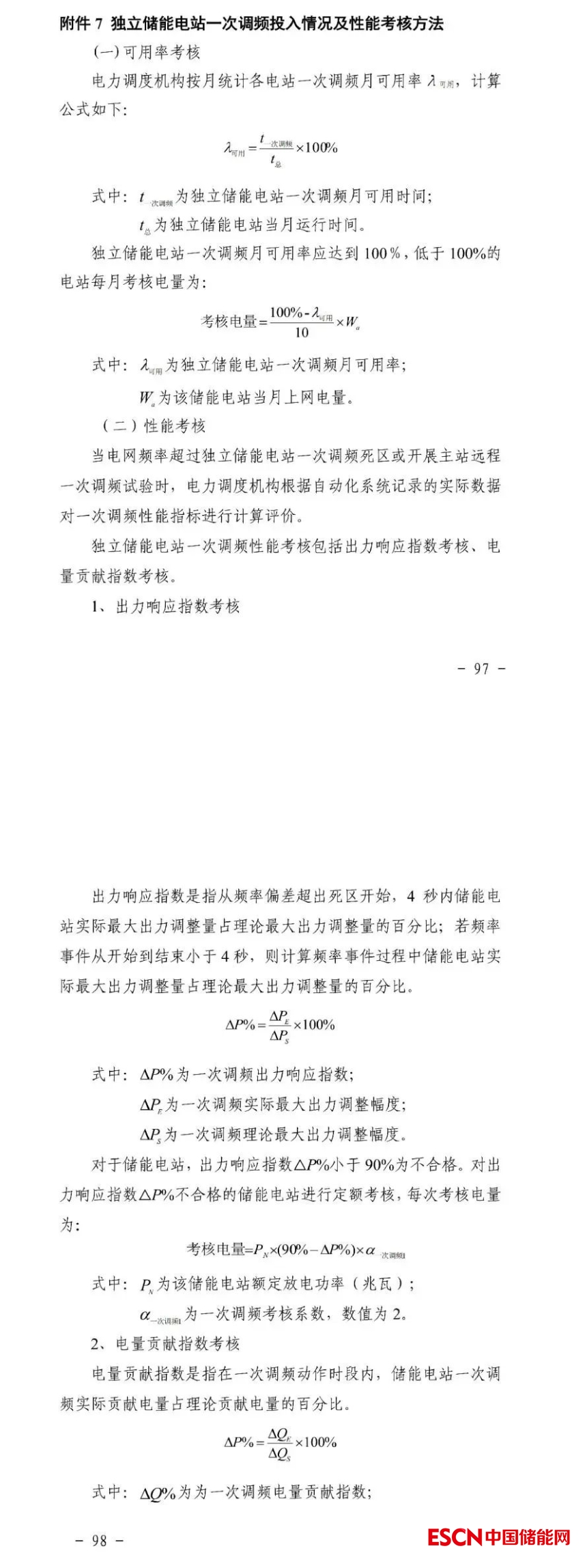 獨(dú)立儲(chǔ)能電站應(yīng)具備一次調(diào)頻功能,并保持一次調(diào)頻功能投入,一次調(diào)頻投/退信號(hào)應(yīng)接入電力調(diào)度機(jī)構(gòu)。獨(dú)立儲(chǔ)能電站一次調(diào)頻的死區(qū)、調(diào)節(jié)容量、調(diào)節(jié)速率、調(diào)節(jié)精度、響應(yīng)時(shí)間等性能指標(biāo)應(yīng)滿足國(guó)家標(biāo)準(zhǔn)要求。當(dāng)電網(wǎng)頻率波動(dòng)時(shí)應(yīng)自動(dòng)參與一次調(diào)頻,未經(jīng)電力調(diào)度機(jī)構(gòu)批準(zhǔn),不得擅自退出一次調(diào)頻功能。對(duì)獨(dú)立儲(chǔ)能電站一次調(diào)頻的可用率和性能進(jìn)行考核,月度累計(jì)考核電量不超當(dāng)月上網(wǎng)電量1%。