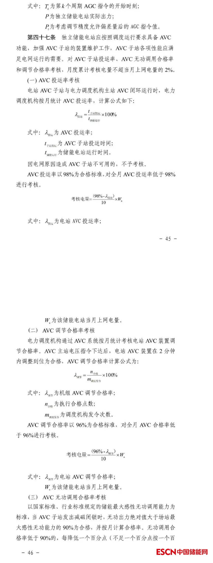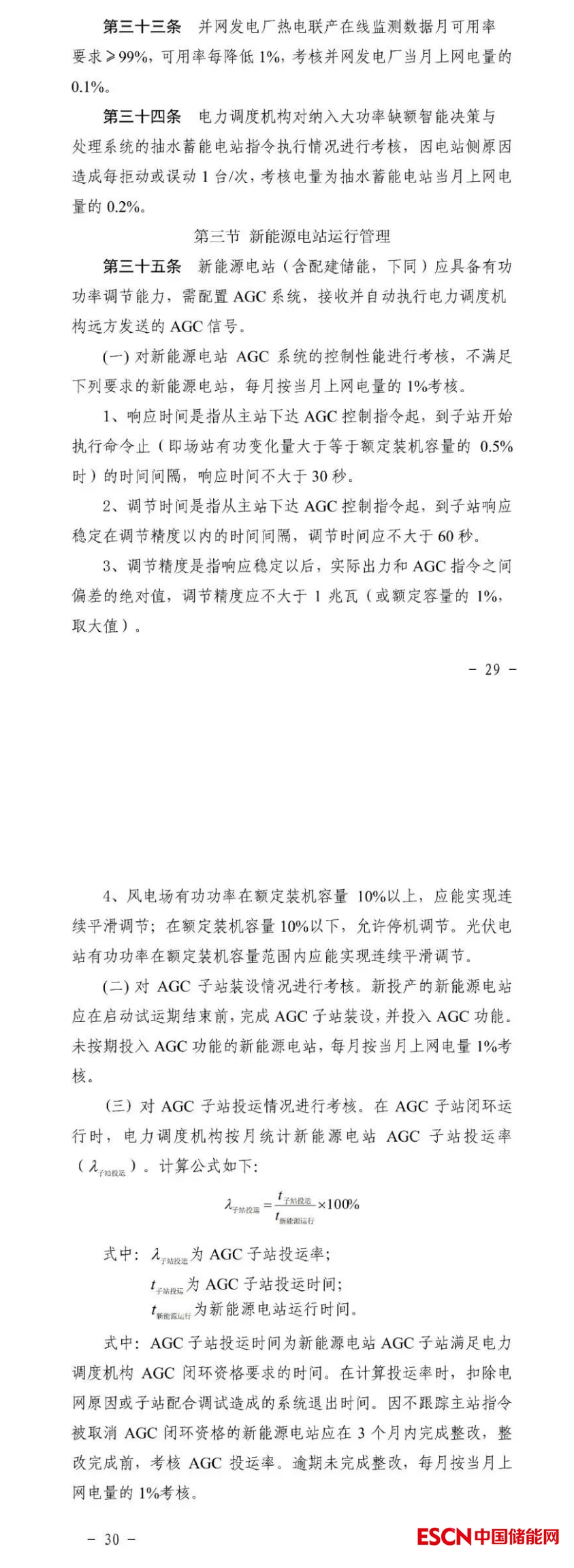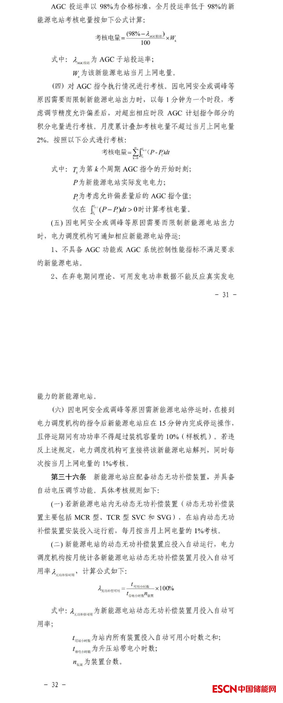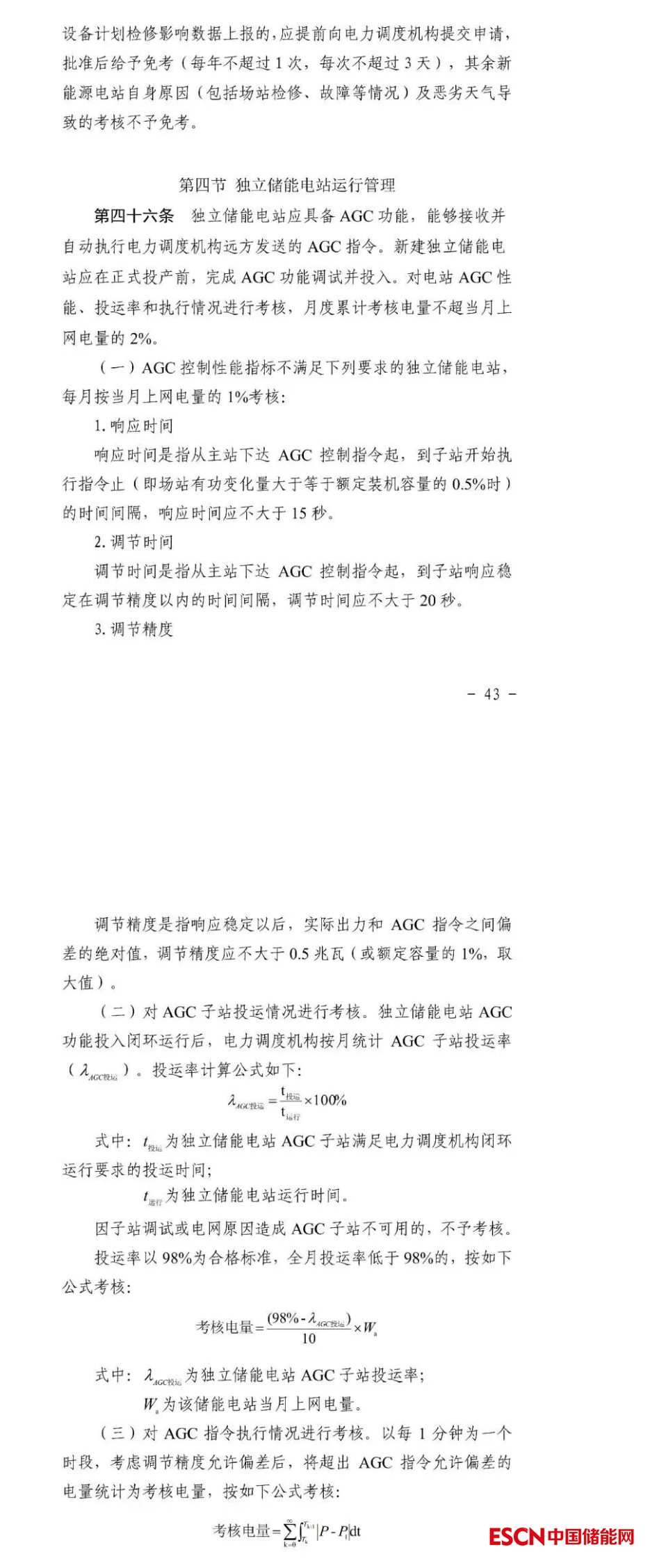 獨(dú)立儲(chǔ)能電站應(yīng)具備AGC功能,能夠接收并自動(dòng)執(zhí)行電力調(diào)度機(jī)構(gòu)遠(yuǎn)方發(fā)送的AGC指令。新建獨(dú)立儲(chǔ)能電站應(yīng)在正式投產(chǎn)前,完成AGC功能調(diào)試并投入。對(duì)電站AGC性能、投運(yùn)率和執(zhí)行情況進(jìn)行考核,月度累計(jì)考核電量不超當(dāng)月上網(wǎng)電量的2%。