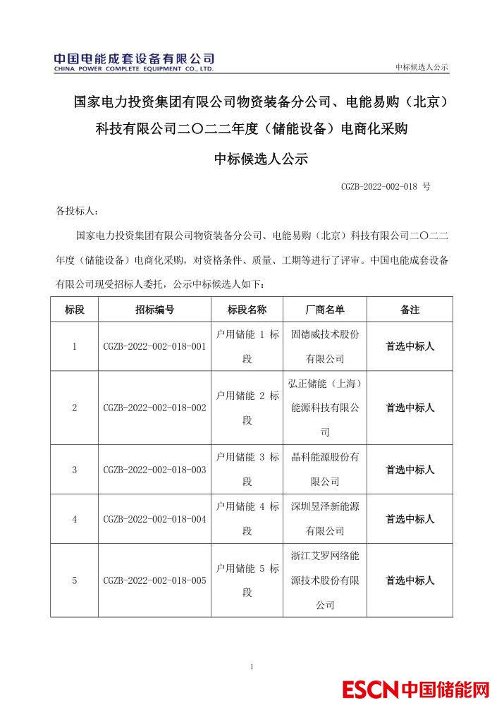 中國儲能網(wǎng)訊:近日,國家電投發(fā)布了2022年度儲能設(shè)備電商化采購中標(biāo)候選人公示,其中戶用儲能6個標(biāo)段分別由固德威、弘正儲能、晶科能源、昱澤新能源、浙江艾羅網(wǎng)絡(luò)能源、許昌智能繼電器中標(biāo);