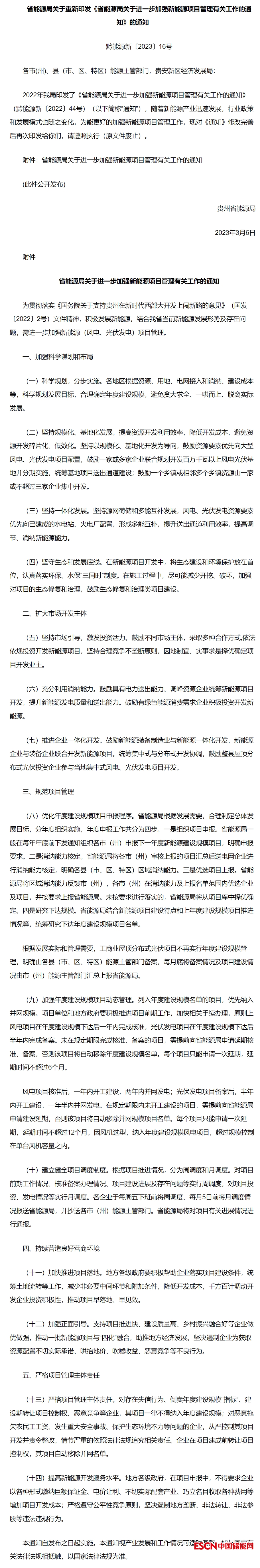 中國(guó)儲(chǔ)能網(wǎng)訊:3月10日,貴州省能源局發(fā)布關(guān)于重新印發(fā)《省能源局關(guān)于進(jìn)一步加強(qiáng)新能源項(xiàng)目管理有關(guān)工作的通知》。據(jù)悉,該通知在2022年6月第一次發(fā)布,本次重新印發(fā),通知中的政策延續(xù)。