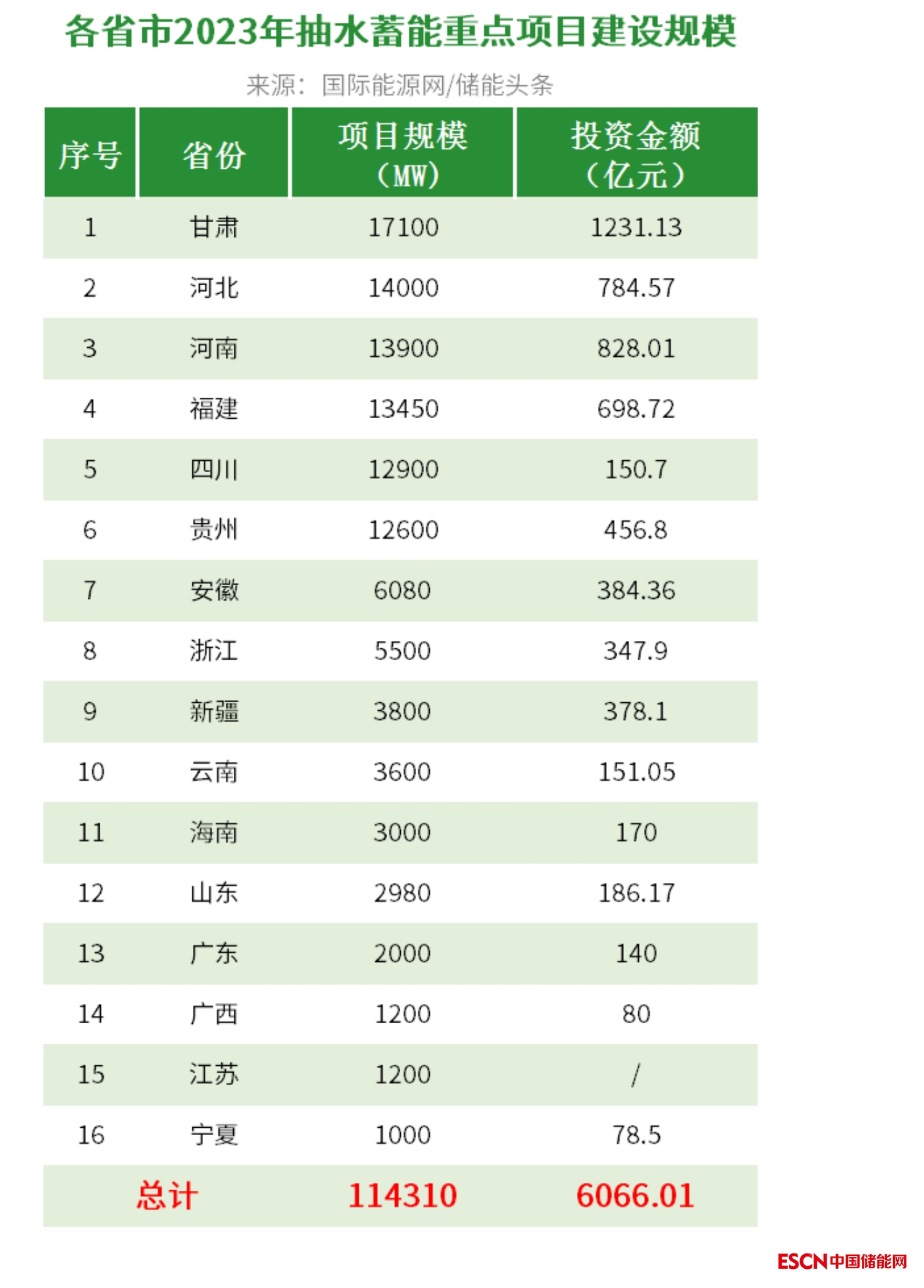 據(jù)據(jù)國際能源網(wǎng)/儲能頭條(微信號:chuneng365)統(tǒng)計,截至目前,2023年甘肅、河北、河南、福建、四川、貴州、安徽、浙江、新疆等省份共公布重點抽水蓄能項目累計達(dá)80個,規(guī)??傆嬤_(dá)115.7GW,項目總投資6144.15億元。