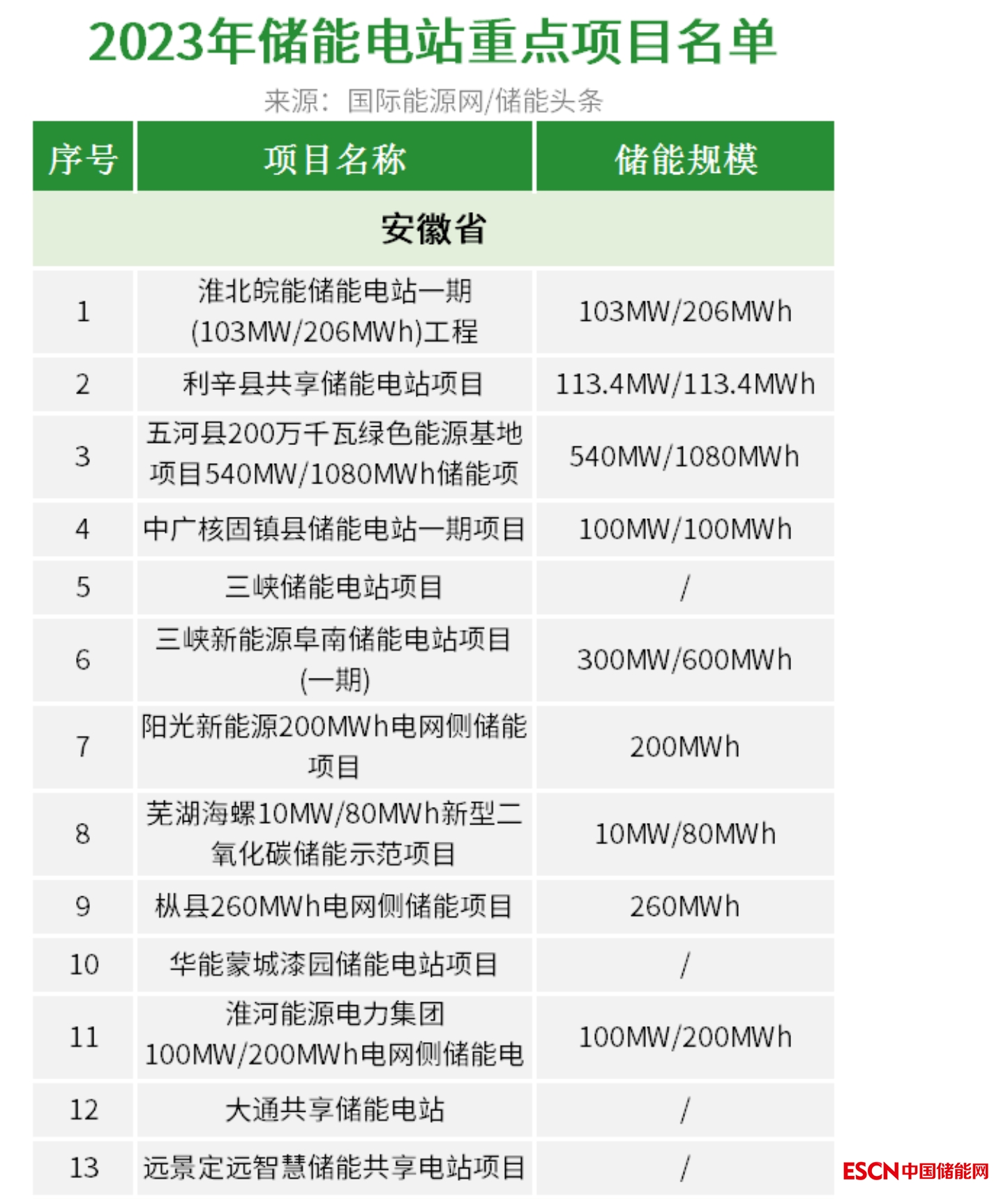 安徽省儲能建設(shè)項目13個,其中包括淮北皖能儲能電站一期工程、中廣核固鎮(zhèn)縣儲能電站一期項目、三峽儲能電站項目等大型規(guī)模項目。