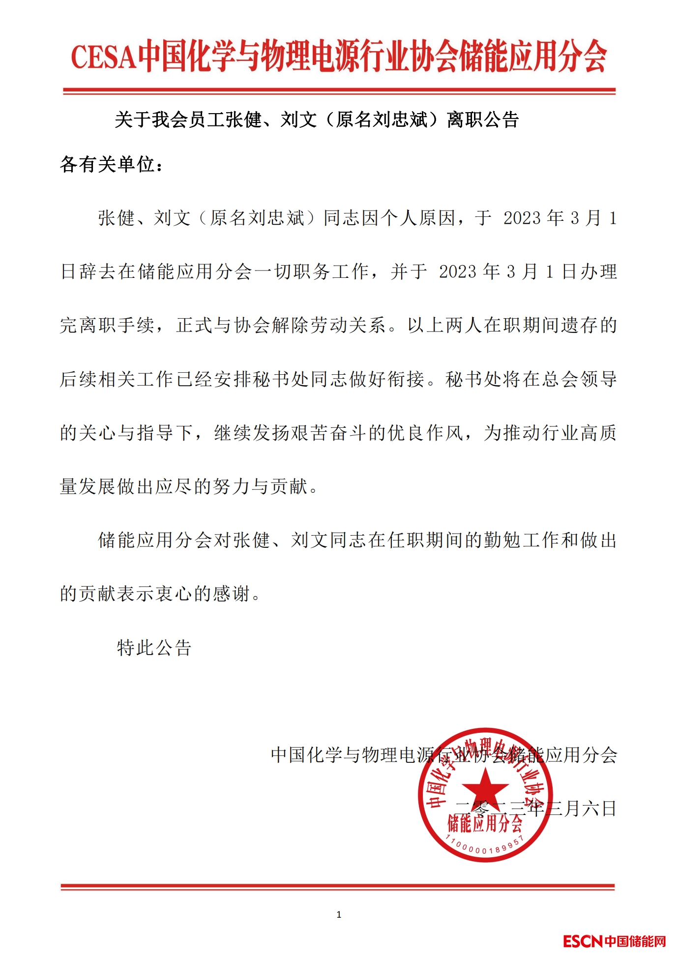張健、劉文(原名劉忠斌)同志因個人原因,于 2023年3月1日辭去在儲能應用分會一切職務工作,并于 2023年3月1日辦理完離職手續(xù),正式與協(xié)會解除勞動關(guān)系。以上兩人在職期間遺存的后續(xù)相關(guān)工作已經(jīng)安排秘書處同志做好銜接。秘書處將在總會領(lǐng)導的關(guān)心與指導下,繼續(xù)發(fā)揚艱苦奮斗的優(yōu)良作風,為推動行業(yè)高質(zhì)量發(fā)展做出應盡的努力與貢獻。
