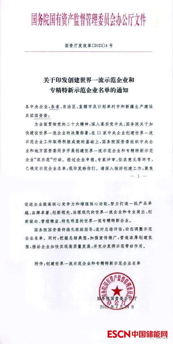 中國儲能網(wǎng)訊:近日,國務(wù)院國資委辦公廳發(fā)布了《關(guān)于印發(fā)創(chuàng)世界一流示范企業(yè)和專精特新示范企業(yè)名單的通知》,新風光電子科技股份有限公司成功入選,成為全國首批200家創(chuàng)建世界一流專精特新企業(yè)之一,也是山東省三家入選企業(yè)之一。