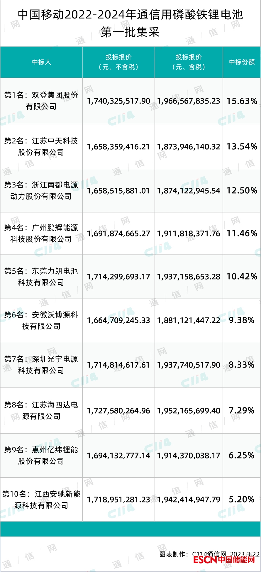 中國儲能網(wǎng)訊:3月22日消息(焦焦)從中國移動官網(wǎng)獲悉,中國移動日前公示了2022年至2024年通信用磷酸鐵鋰電池產(chǎn)品第一批次集采結果,雙登、中天、南都、鵬輝等10家中標。