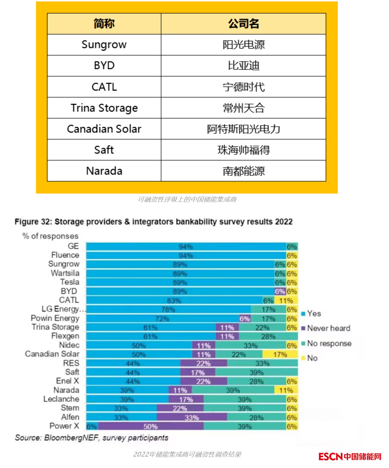 BNEF 2022年全球儲能產(chǎn)品及系統(tǒng)集成商可融資性評級上出現(xiàn)了中國儲能集成商的身影。