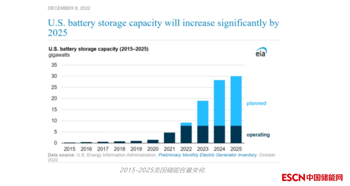 在 2020 年之前,美國的儲能容量可以忽略不計,這一年之后則迅速增加。截至 2022 年 10 月,全美已有7.8 GW 的大規(guī)模儲能設(shè)施開始運營,且預計到年底還將增加 1.4 GW 的儲能容量。EIA 預計 2023 年至 2025 年將增加 20.8 GW 的儲能容量。儲能容量的增長速度超過了太陽能裝機容量的早期增長速度。美國的太陽能容量從 2010 年開始擴張,從 2010 年的不到 1吉瓦增長到 2015 年的 13.7 吉瓦。
