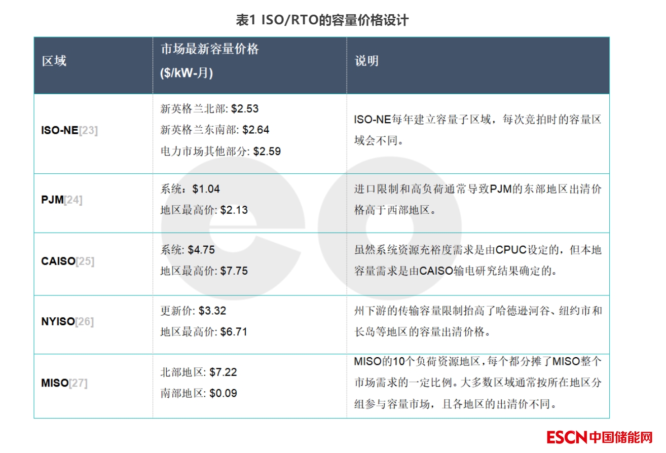 讓各種資源在一個(gè)公平的環(huán)境下競(jìng)爭(zhēng),不僅要考慮資源的物理特征,還要將資源的位置納入考慮范圍之中。將電力輸送到需求地點(diǎn)的能力是可靠性的一個(gè)關(guān)鍵要素。受輸電約束影響而限制了供電能力的發(fā)電機(jī)組對(duì)系統(tǒng)可靠性的貢獻(xiàn)相對(duì)較低,而輸電能力高的發(fā)電機(jī)組對(duì)系統(tǒng)可靠性的貢獻(xiàn)相對(duì)較高。美國(guó)的每個(gè)容量市場(chǎng)都通過發(fā)展“區(qū)域” (zonal)或“本地”容量需求(local capacity requirement)來反映這些因素。按照這種概念,ISO/RTO在每個(gè)區(qū)域內(nèi)都要設(shè)置不同的最低發(fā)電量,以確保該地區(qū)的可靠性,而這往往導(dǎo)致有輸電堵塞的地區(qū)的容量?jī)r(jià)格較高。這大概類似于在輸電約束的影響下,各區(qū)節(jié)點(diǎn)邊際電價(jià)中產(chǎn)生的價(jià)格差異[22]。下表展示了幾個(gè)容量市場(chǎng)的設(shè)計(jì)。