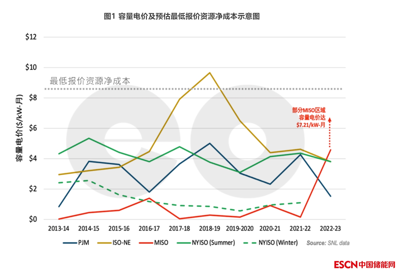 容量電費(fèi)不應(yīng)保證對(duì)現(xiàn)有資源的固定成本回收。這樣做有風(fēng)險(xiǎn),可能會(huì)延長(zhǎng)不經(jīng)濟(jì)資源的使用壽命,增加系統(tǒng)成本,取代其它更低成本的資源,并阻礙脫碳和空氣質(zhì)量目標(biāo)的實(shí)現(xiàn)。美國(guó)在2010年代的大部分年份中,電力系統(tǒng)都出現(xiàn)了容量過剩,超出了滿足可靠性目標(biāo)的需要。產(chǎn)生這樣結(jié)果的部分原因來自于2000年代天然氣發(fā)電裝機(jī)容量的大規(guī)模擴(kuò)張,能效投資導(dǎo)致負(fù)荷接近零增長(zhǎng),以及其他政策驅(qū)動(dòng)引起的可再生能源增加。最終的結(jié)果是,容量電價(jià)往往明顯低于新增最低報(bào)價(jià)資源的凈成本[7],這一價(jià)格信號(hào)鼓勵(lì)過剩容量逐漸退出市場(chǎng)。如下圖所示,在這方面,美國(guó)容量市場(chǎng)的“自我糾正”表現(xiàn)符合預(yù)期。