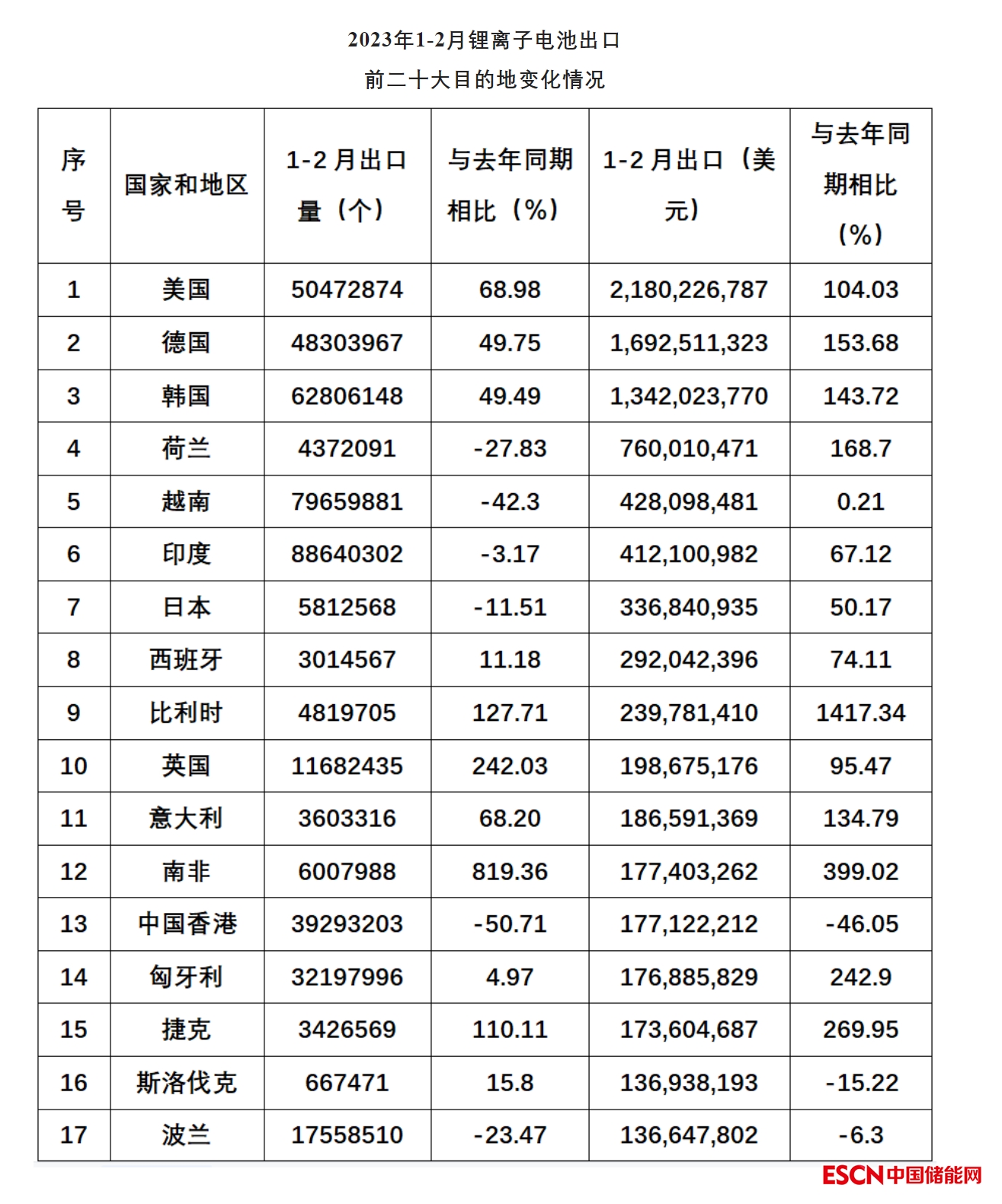 其中,2023年1月鋰離子電池出口額為56.48億美元,2022年1月為33.25億美元,同比增長(zhǎng)66.8%;2023年1月鋰離子電池出口數(shù)量為3.02億只,2022年1月為3.89億個(gè),同比減少22.4%。2023年2月鋰離子電池出口額46.11億美元,2022年2月為22.71億美元,同比增長(zhǎng)103%;2023年2月鋰離子電池出口數(shù)量為2.38億個(gè),2022年2月為2.27億個(gè),同比增長(zhǎng)4.8%。
