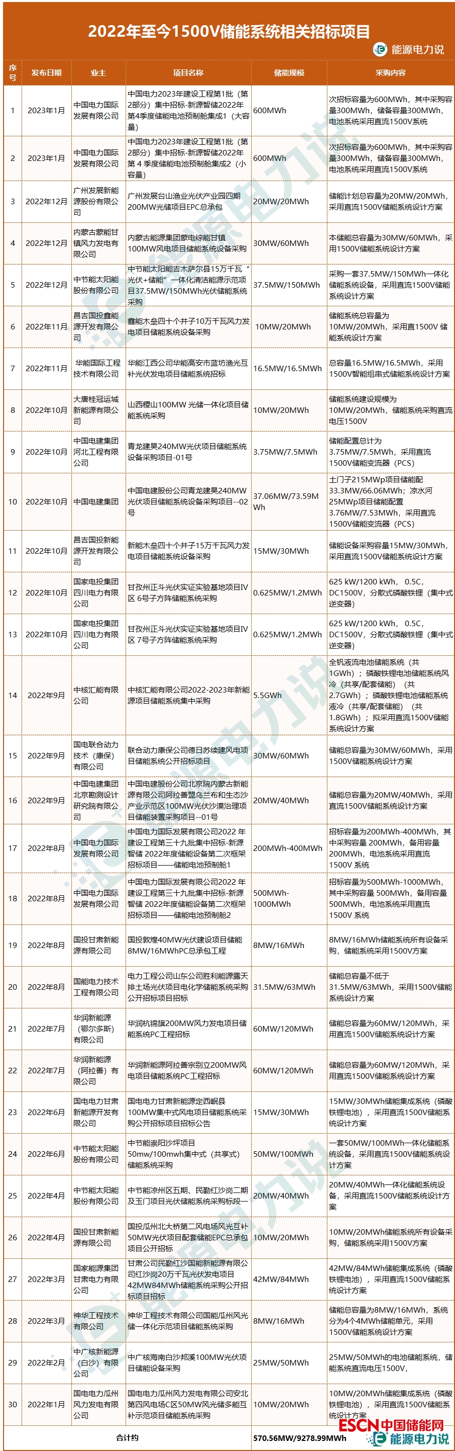 據(jù)不完全統(tǒng)計(jì),2022年以來, 采用1500V儲(chǔ)能系統(tǒng)的招標(biāo)項(xiàng)目超9GWh,其中“中核匯能有限公司2022-2023年新能源項(xiàng)目?jī)?chǔ)能系統(tǒng)集中采購(gòu)項(xiàng)目”,采購(gòu)全釩液流及磷酸鐵鋰電池儲(chǔ)能系統(tǒng)總規(guī)模達(dá)5.5GWh,明確項(xiàng)目擬采用直流1500V儲(chǔ)能系統(tǒng)設(shè)計(jì)方案。從近期招標(biāo)項(xiàng)目數(shù)量來看,1500V儲(chǔ)能系統(tǒng)已成為各發(fā)電集團(tuán)主流儲(chǔ)能系統(tǒng)電壓等級(jí)。