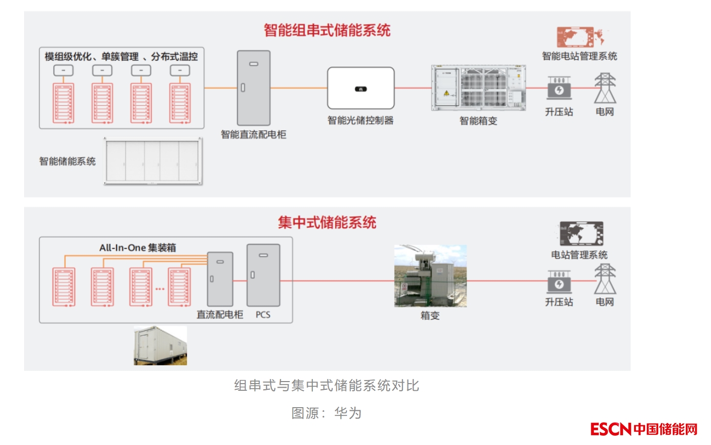 目前業(yè)內(nèi)電池儲(chǔ)能系統(tǒng)主要采取集中式PCS,多組電池并聯(lián)將引起電池簇之間的不均衡;組串式PCS可以實(shí)現(xiàn)簇級(jí)管理,提升系統(tǒng)壽命,提高全壽命周期放電容量,組串式PCS規(guī)?;瘧?yīng)用趨勢(shì)已見雛形。比如華能黃臺(tái)100MW/200MWh項(xiàng)目,是國(guó)內(nèi)首個(gè)采用組串式PCS架構(gòu)的大型儲(chǔ)能電站(PCS由上能電氣提供);山東德州林洋光儲(chǔ)3MW/6MWh項(xiàng)目也采用該系統(tǒng)架構(gòu)(華為提供整套系統(tǒng))。