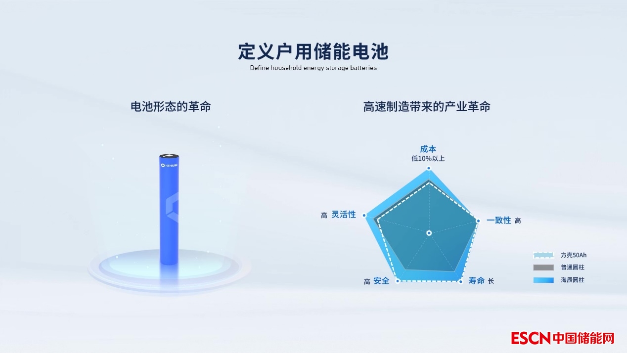 海辰大圓柱戶(hù)用儲(chǔ)能專(zhuān)用電池與傳統(tǒng)小方殼以及小圓柱電池相比,在成本、配組靈活性、安全性、壽命以及一致性上實(shí)現(xiàn)了大幅提升。例如在成本方面,大圓柱電池在生產(chǎn)方面依托高速產(chǎn)線輸出,成本優(yōu)勢(shì)明顯,其相較傳統(tǒng)生產(chǎn)低10%以上;又如在循環(huán)壽命方面較傳統(tǒng)圓柱電池大幅提升,突破5000次大關(guān);同時(shí),其靈活適配性更強(qiáng),可滿(mǎn)足戶(hù)用儲(chǔ)能應(yīng)用場(chǎng)景定制化需求。