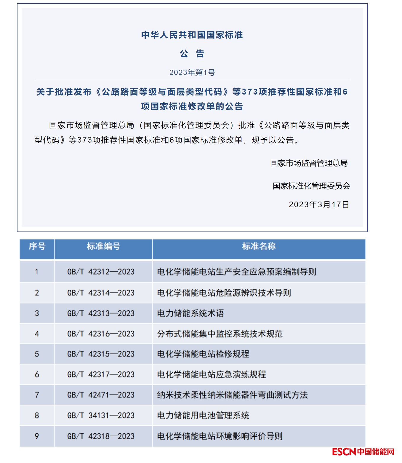 中國(guó)儲(chǔ)能網(wǎng)訊:近日,國(guó)家市場(chǎng)監(jiān)督管理總局、國(guó)家標(biāo)準(zhǔn)化管理委員會(huì)發(fā)布2023年第1號(hào)中國(guó)國(guó)家標(biāo)準(zhǔn)公告,批準(zhǔn)發(fā)布373項(xiàng)推薦性國(guó)家標(biāo)準(zhǔn)和6項(xiàng)國(guó)家標(biāo)準(zhǔn)修改單。