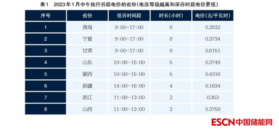 2022年底,多個省份對用戶銷售電價進行調整,主要調整了峰、平、谷時段,拉大了峰谷價差。根據(jù)各?。▍^(qū))發(fā)布的電網(wǎng)代理購電價格顯示,至少有8?。▍^(qū))在中午光伏出力高峰期執(zhí)行谷段電價,具體見表1。