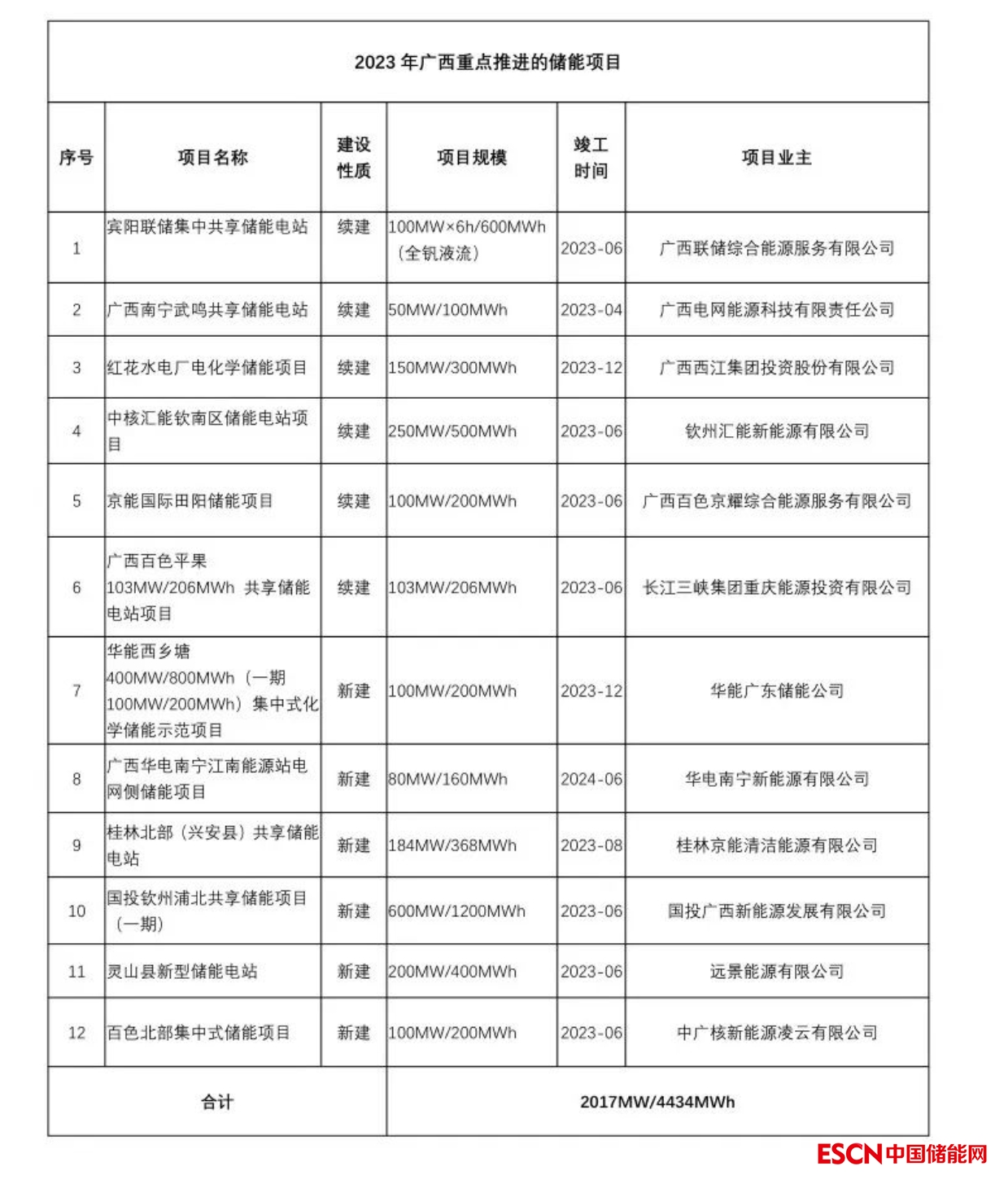 關(guān)于儲(chǔ)能部分,《方案》強(qiáng)調(diào)要加快新型儲(chǔ)能建設(shè)。2023年計(jì)劃完成投資47.02 億元,共實(shí)施12個(gè)項(xiàng)目,總裝機(jī)2017MW/4434MWh。其中,開(kāi)工建設(shè)國(guó)投欽州浦北共享儲(chǔ)能項(xiàng)目(一期)、靈山縣新型儲(chǔ)能電站、桂林北部(興安縣)共享儲(chǔ)能電站等一批儲(chǔ)能項(xiàng)目,加快紅花水電廠電化學(xué)儲(chǔ)能項(xiàng)目、廣西南寧武鳴共享儲(chǔ)能電站等在建項(xiàng)目建設(shè),年底全部建成投運(yùn)。