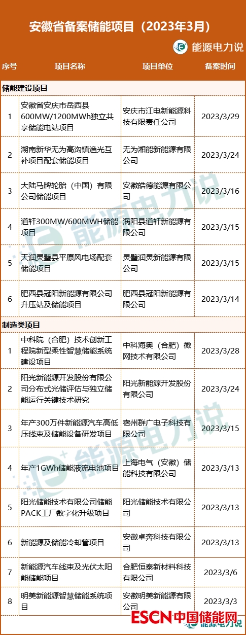 3月,安徽省備案儲(chǔ)能項(xiàng)目14個(gè)。其中儲(chǔ)能建設(shè)類(lèi)項(xiàng)目6個(gè),包括獨(dú)立共享儲(chǔ)能、漁光互補(bǔ)、風(fēng)電場(chǎng)等配套儲(chǔ)能電站項(xiàng)目;儲(chǔ)能產(chǎn)品制造類(lèi)項(xiàng)目8個(gè),涉及儲(chǔ)能系統(tǒng)、儲(chǔ)能關(guān)鍵技術(shù)研發(fā)、儲(chǔ)能設(shè)備、液流電池等儲(chǔ)能產(chǎn)業(yè)鏈產(chǎn)品制造。