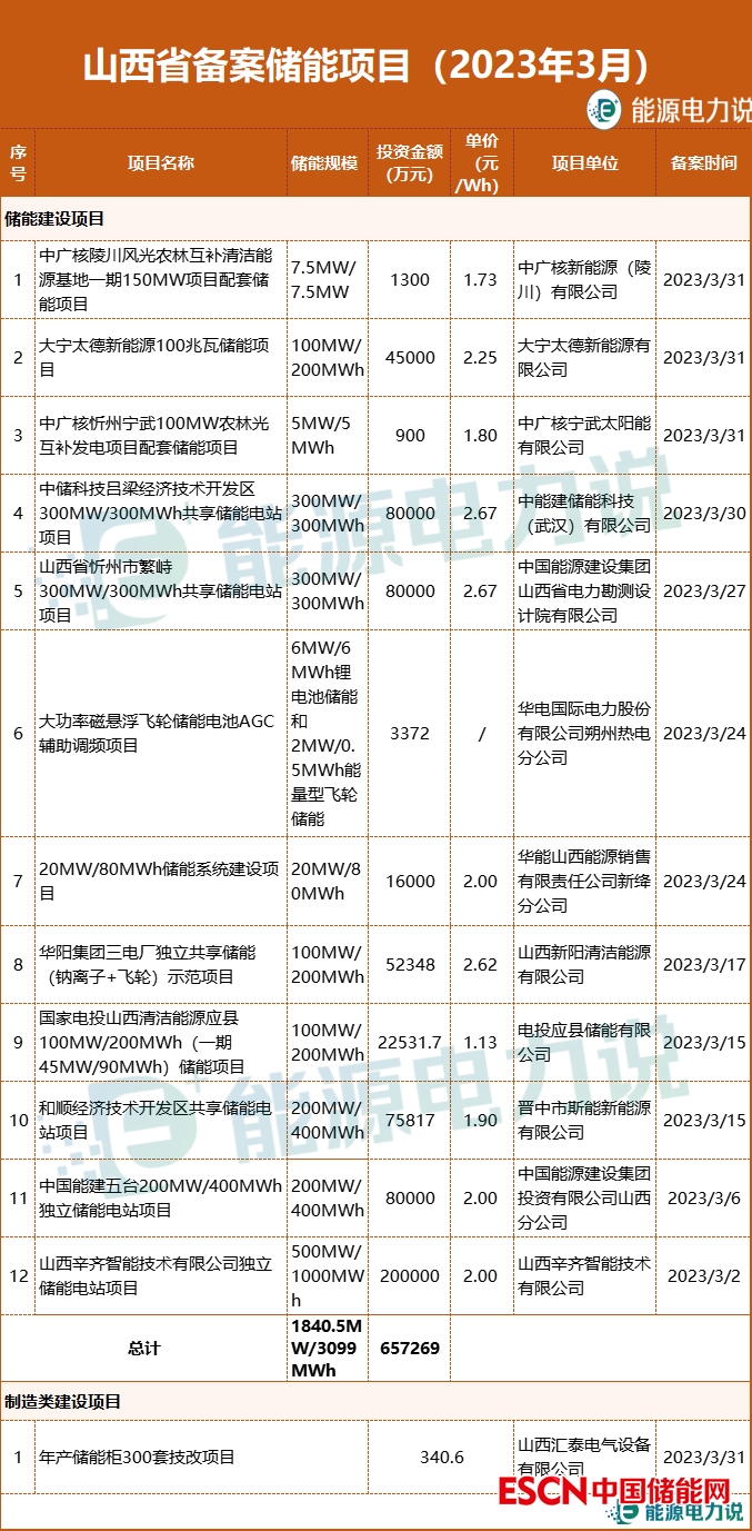3月,山西省備案儲(chǔ)能項(xiàng)目13個(gè),其中儲(chǔ)能建設(shè)項(xiàng)目12個(gè),儲(chǔ)能產(chǎn)品制造類(lèi)項(xiàng)目1個(gè),為山西匯泰電氣設(shè)備有限公司年產(chǎn)儲(chǔ)能柜300套技改項(xiàng)目。