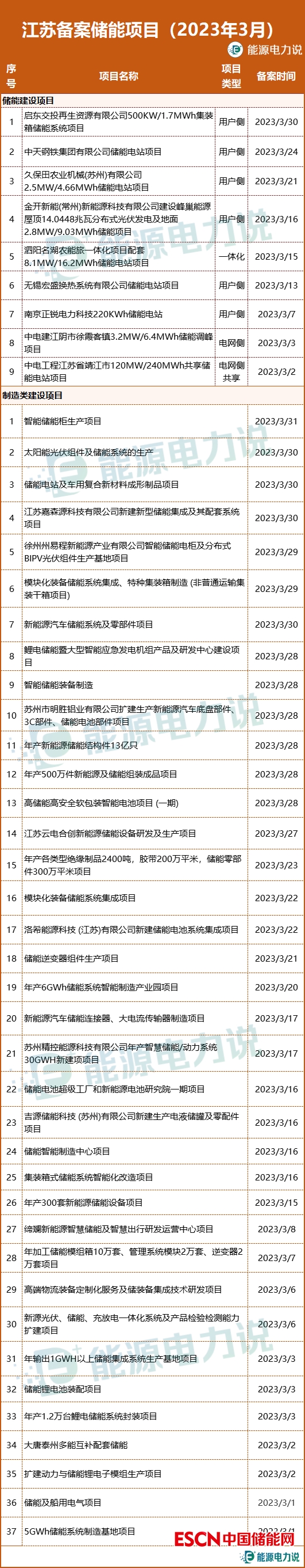 3月,江蘇省備案儲(chǔ)能項(xiàng)目46個(gè),其中儲(chǔ)能建設(shè)項(xiàng)目9個(gè),儲(chǔ)能產(chǎn)品制造類(lèi)項(xiàng)目37個(gè)。