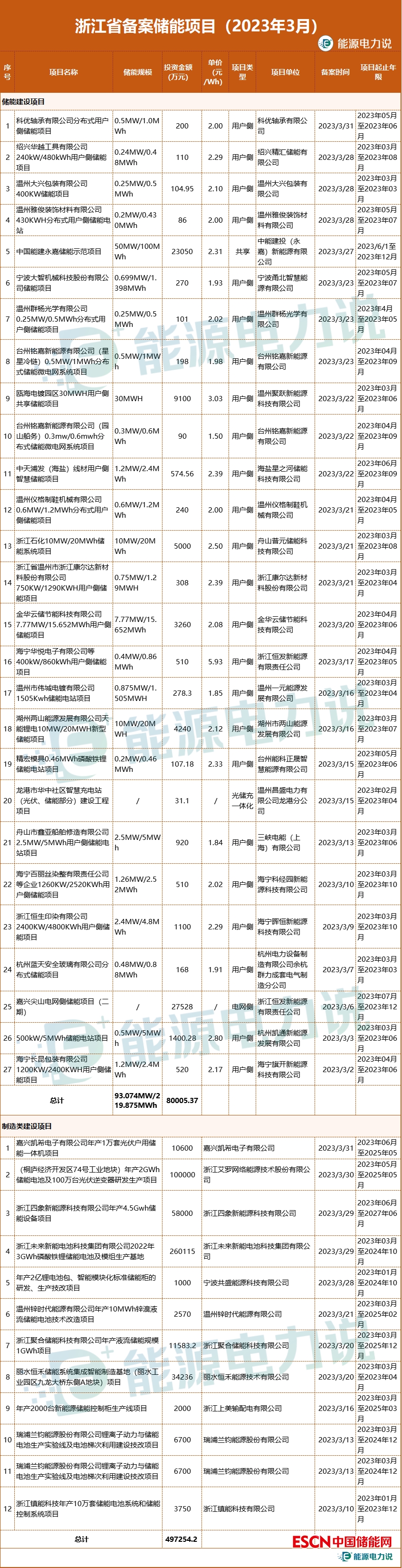 3月,浙江省備案儲(chǔ)能項(xiàng)目39個(gè),其中儲(chǔ)能建設(shè)項(xiàng)目27個(gè),總規(guī)模約93.074MW/219.875MWh,總投資金額約8億元,以工商業(yè)用戶側(cè)儲(chǔ)能項(xiàng)目為主;儲(chǔ)能產(chǎn)品制造類(lèi)項(xiàng)目12個(gè),總投資金額約49.7億元,包括生產(chǎn)或研發(fā)儲(chǔ)能電池的原材料或制造設(shè)備、儲(chǔ)能系統(tǒng)、液流儲(chǔ)能、儲(chǔ)能設(shè)備等儲(chǔ)能產(chǎn)業(yè)鏈產(chǎn)品制造的生產(chǎn)及研發(fā)。