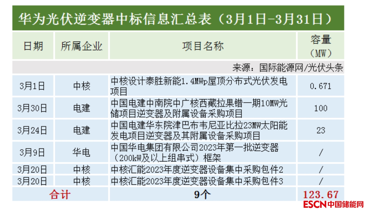 本統(tǒng)計(jì)周期,華為中標(biāo)中國電建、中核集團(tuán)、華電等企業(yè)9個(gè)項(xiàng)目(標(biāo)段),確定中標(biāo)容量123.67MW。