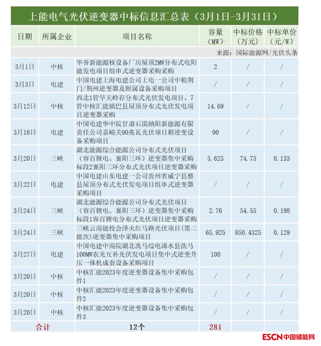 本統(tǒng)計(jì)周期,上能電氣位列中標(biāo)容量榜頭名位置,中標(biāo)中核集團(tuán)、中國電建、三峽集團(tuán)等企業(yè)12項(xiàng)目(標(biāo)段),合計(jì)中標(biāo)容量281MW。