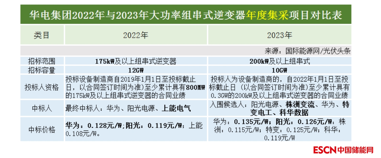 值得關(guān)注的是中國華電集團(tuán)有限公司2022年組串式逆變器框架采購標(biāo)段二同樣對(duì)175kW及以上組串式逆變器進(jìn)行集中采購,國際能源網(wǎng)/光伏頭條(PV-2005)通過對(duì)比2023與2022年大功率組串式逆變器的招中標(biāo)情況,發(fā)現(xiàn)華電大功率組串式逆變器在設(shè)備要求以及容量、中標(biāo)人、中標(biāo)價(jià)格方面存在諸多變化。