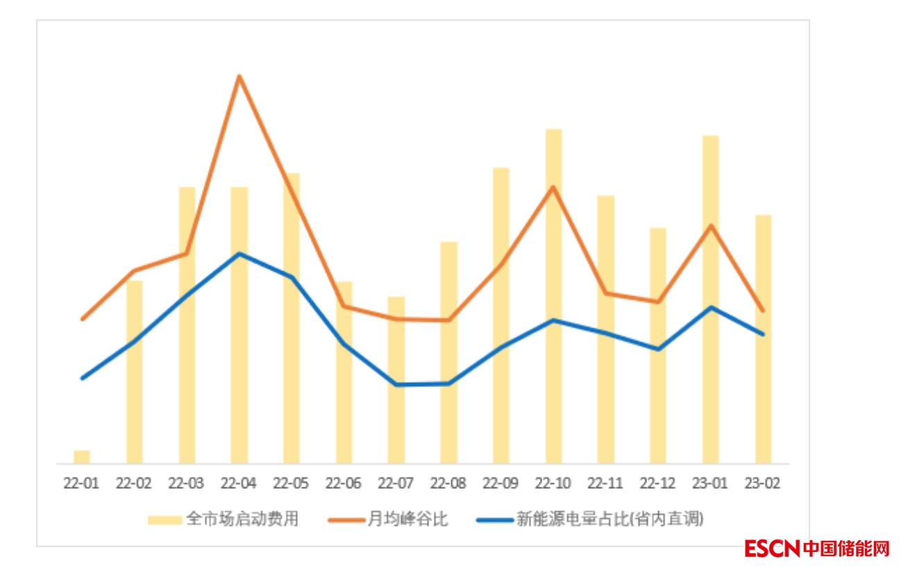 圖6 該省啟動費用與峰谷比、新能源發(fā)電量占比月度走勢