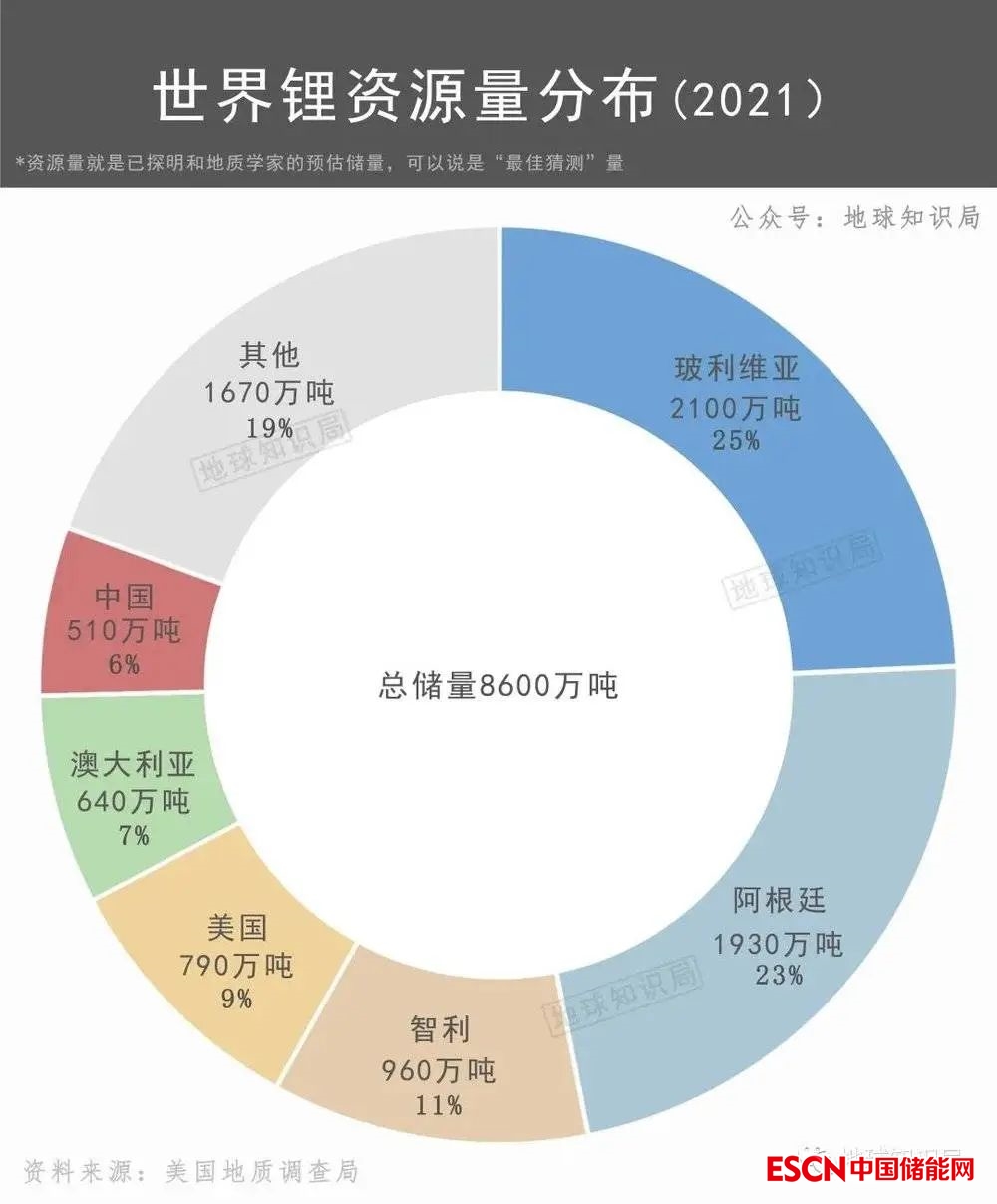 中國的鋰,從儲(chǔ)量來看并不算太少,根據(jù)相關(guān)統(tǒng)計(jì)數(shù)據(jù),全球鋰資源量8600萬噸,所謂資源量就是已探明的量,加上地質(zhì)學(xué)家預(yù)估的儲(chǔ)量,可以說是“最佳猜測(cè)值”,其中已探明儲(chǔ)量是2100萬噸。