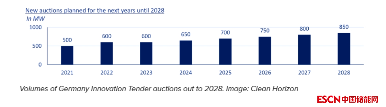 德國(guó)聯(lián)邦網(wǎng)絡(luò)局(Bundesnetzagentur)在2021年推出了創(chuàng)新招標(biāo),為新能源開(kāi)發(fā)商提供并網(wǎng)能源的固定溢價(jià),為期20年,以鼓勵(lì)可再生能源加儲(chǔ)能在全國(guó)的部署。這種招標(biāo)將每年進(jìn)行一次,預(yù)計(jì)到2028年將采購(gòu)5450MW的總?cè)萘俊?