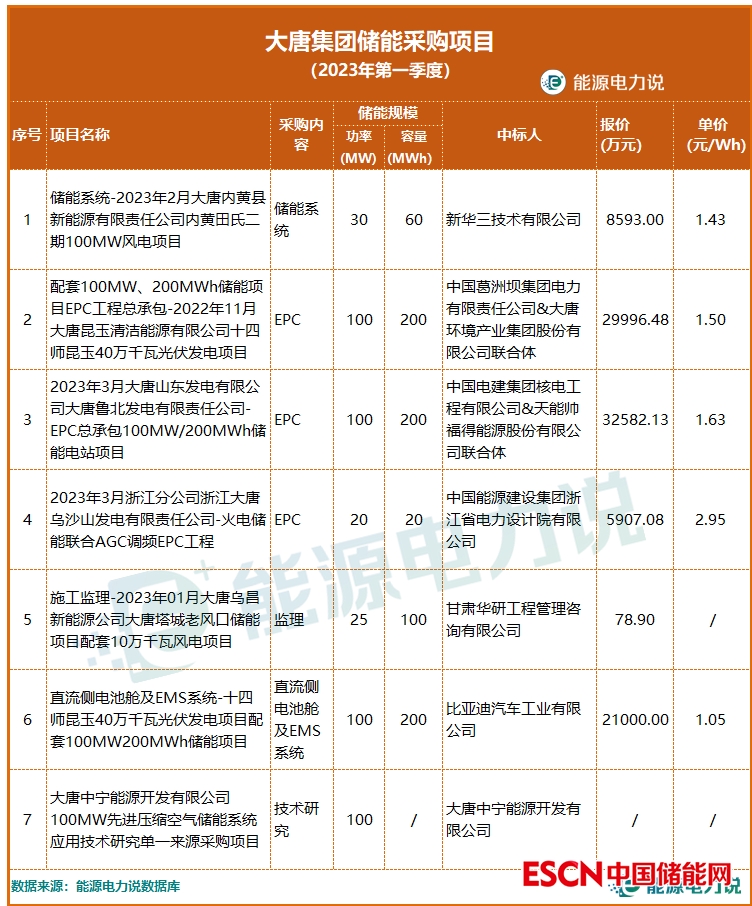 一季度,大唐集團發(fā)布7個儲能相關(guān)采購項目,采購內(nèi)容包括儲能系統(tǒng)、儲能配套設(shè)備、儲能電站EPC等,采購項目儲能技術(shù)路線主要為磷酸鐵鋰。