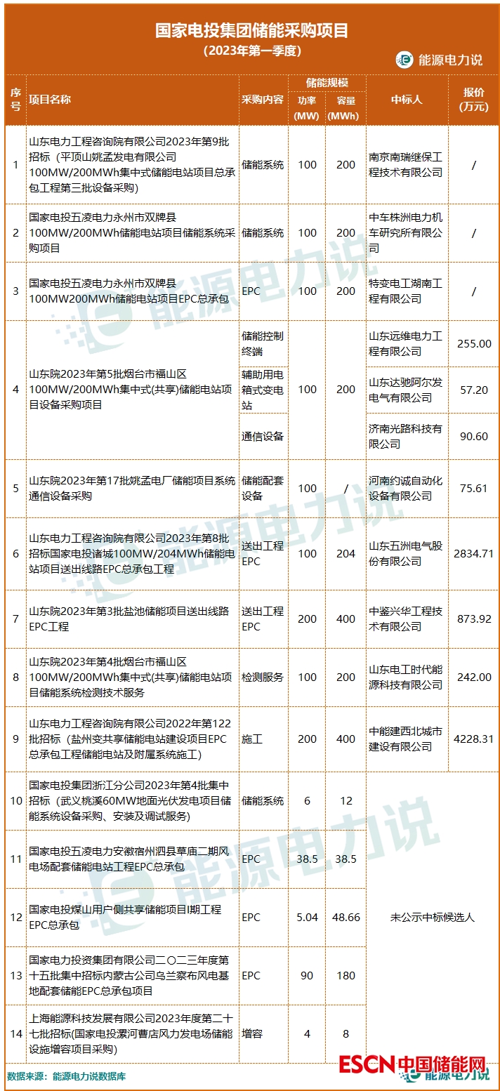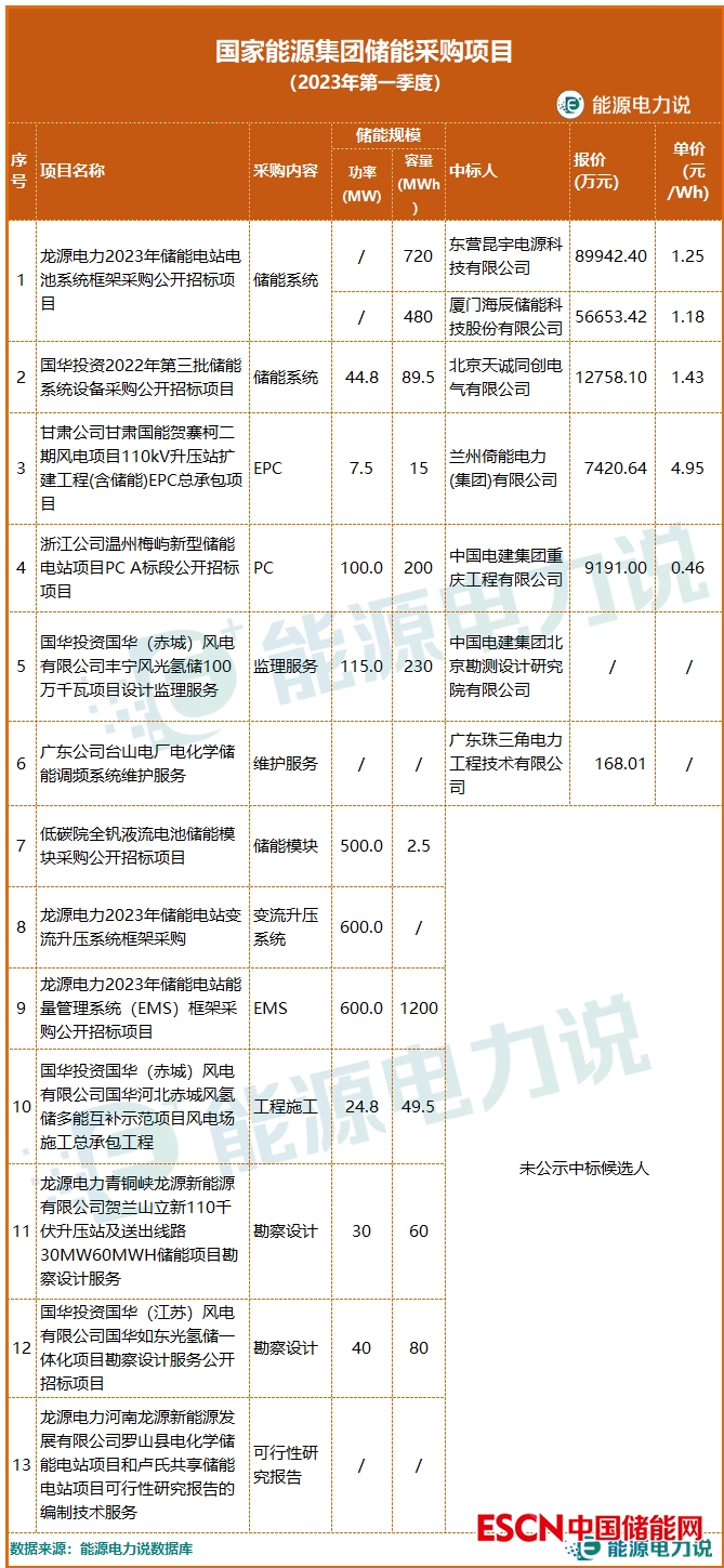 今年一季度,國家能源集團共13個儲能相關(guān)采購項目,采購內(nèi)容包括儲能系統(tǒng)、EMS、監(jiān)理服務(wù)、勘察設(shè)計等,采購項目涉及儲能容量超3GWh。