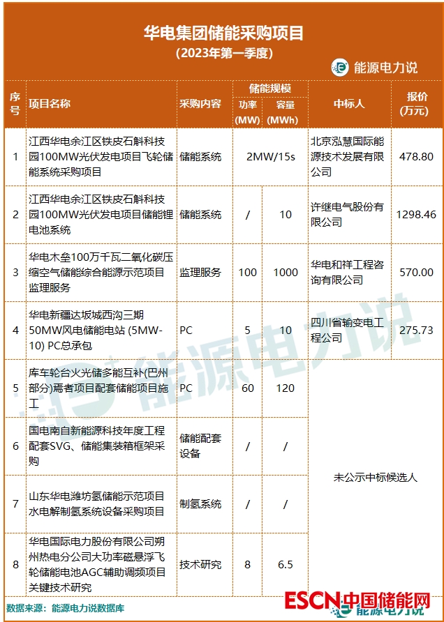今年一季度,華電集團共發(fā)布8個儲能項目采購項目,采購內(nèi)容包括鋰電池儲能系統(tǒng)、飛輪儲能系統(tǒng)、儲能配套設(shè)備、施工、監(jiān)理等;儲能技術(shù)路線涉及磷酸鐵鋰、飛輪儲能、二氧化碳儲能、氫儲能等。