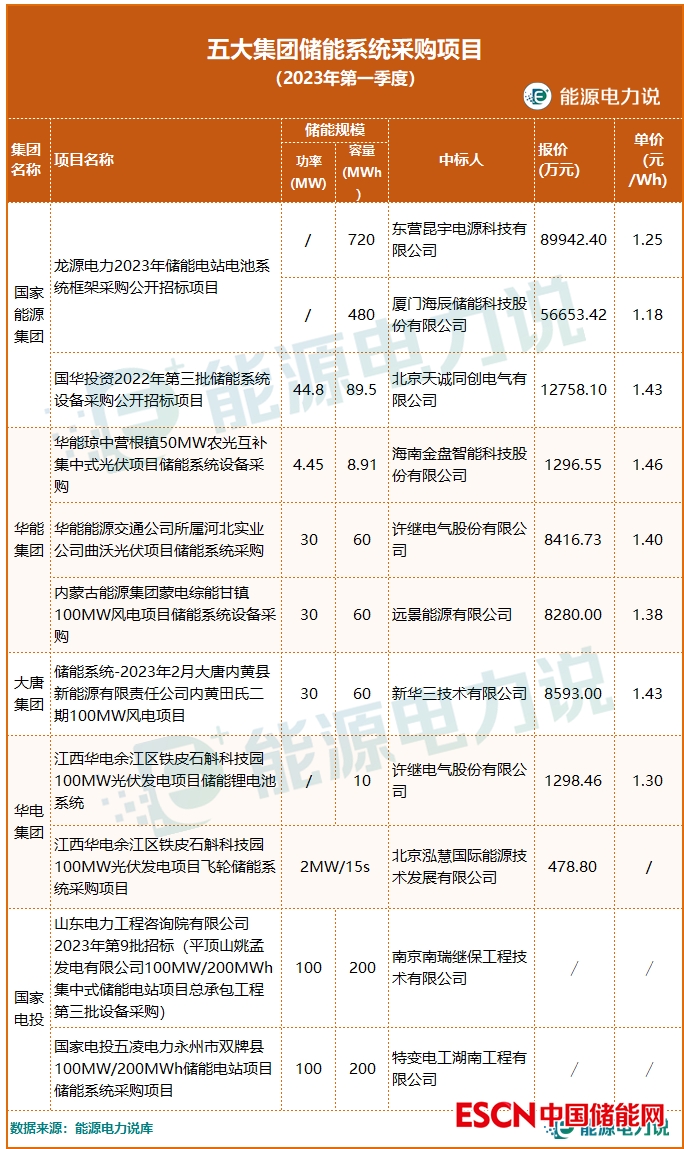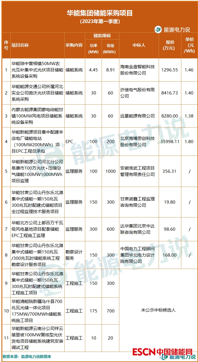 一季度,華能集團共發(fā)布11個儲能相關(guān)采購項目,采購內(nèi)容包括儲能系統(tǒng)、集中式儲能項目EPC、監(jiān)理服務(wù)、勘察設(shè)計等。