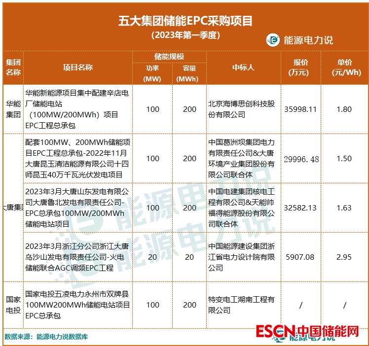 儲能EPC采購項目方面,華電、大唐、電投共完成4個儲能EPC項目采購,合計儲能規(guī)模約420MW/820MWh,單價在1.5-1.8元/Wh之間;其中華能集團項目為鹽光伏項目、東明馬頭鎮(zhèn)光伏項目、煙臺臧家莊光伏項目等多個光伏項目集中配建100MW/200MWh儲能電站EPC項目,由北京海博思創(chuàng)科技股份有限公司中標,中標單價約1.8元/Wh;大唐魯北發(fā)電有限責任公司電廠內(nèi)新建100MW/200MWh儲能電站EPC項目,由中國電建集團核電工程有限公司&天能帥福得能源股份有限公司聯(lián)合體中標,中標單價約1.63元/Wh;此外還有大唐烏沙山發(fā)電廠火電聯(lián)合調(diào)頻項目。