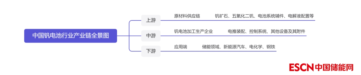 釩電池產(chǎn)業(yè)鏈由上游的原材料供應(yīng)鏈、中游的釩電池加工生產(chǎn)企業(yè)以及下游的應(yīng)用端組成。