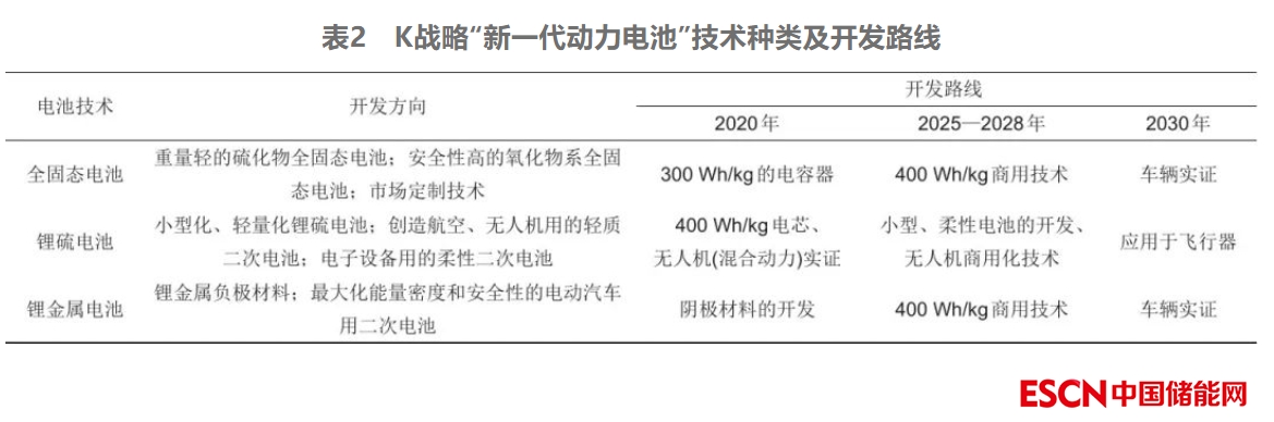 圍繞下一代動(dòng)力電池技術(shù),韓國政府將拉動(dòng)公私合作,支持大規(guī)模電池研發(fā)。K戰(zhàn)略中,韓國政府對研發(fā)路線進(jìn)行了規(guī)劃,主要圍繞新一代電池制造技術(shù)以及實(shí)現(xiàn)全固態(tài)電池、鋰硫電池、鋰金屬電池的商用化,如表2所示。