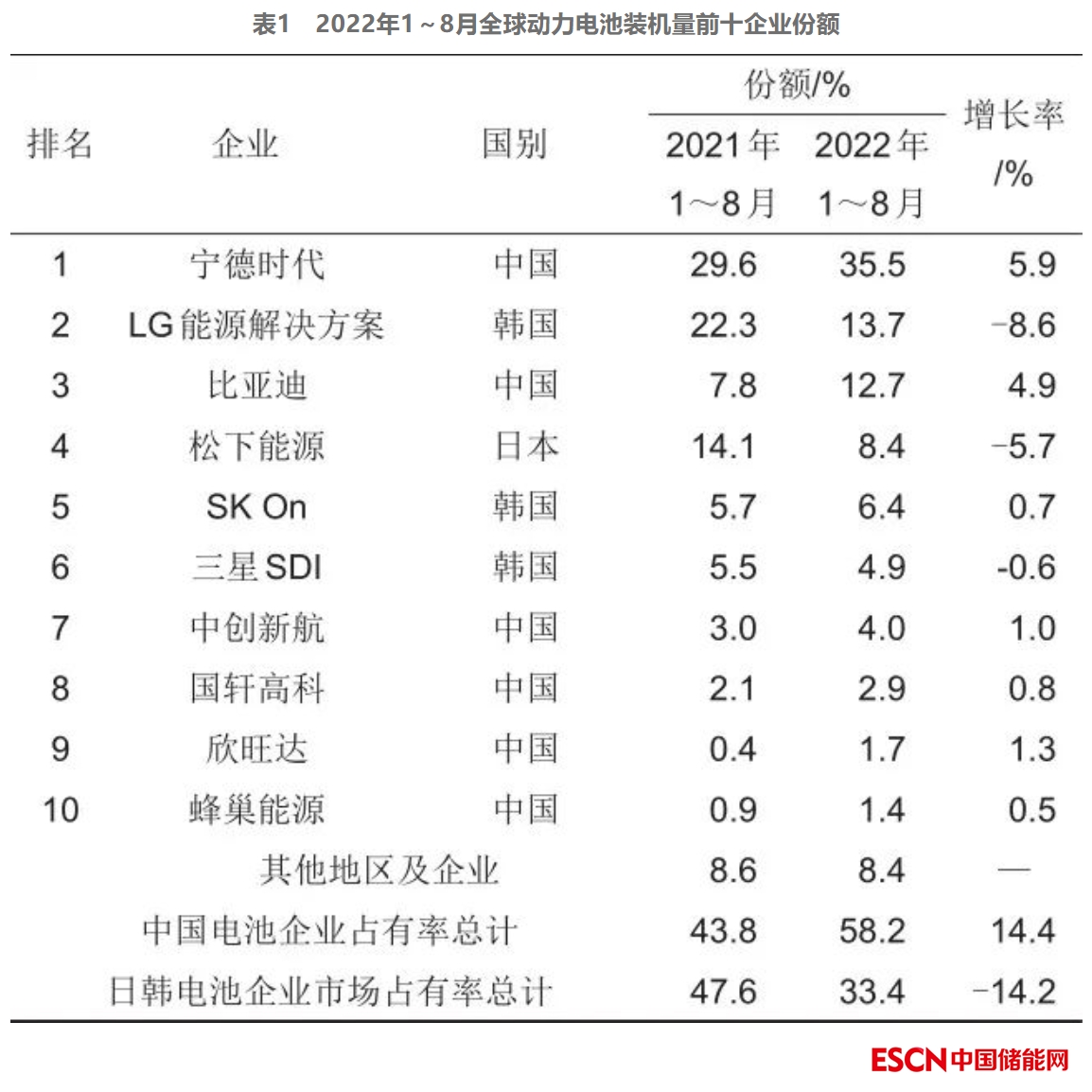 2015年以來,在新能源汽車產(chǎn)業(yè)迅速發(fā)展和“雙碳”目標(biāo)等的帶動(dòng)下,我國動(dòng)力電池產(chǎn)業(yè)取得了快速的發(fā)展,并在全球電池市場占據(jù)領(lǐng)先地位。在全球電池市場中,中國、韓國、日本三個(gè)國家占據(jù)了90%以上的市場份額,形成了三足鼎立的局面。2022年1~8月,在全球動(dòng)力電池裝機(jī)量前十名企業(yè)中,中國企業(yè)有6家,共占58.2%的市場份額;韓國企業(yè)3家,日本企業(yè)1家,日韓企業(yè)合占33.4%的市場份額;歐洲和美國占較少的份額,約為2%。中國電池企業(yè)的市場份額持續(xù)增長,而日韓電池企業(yè)的市場份額呈現(xiàn)下降趨勢,LGEnergy Solution(排名第二,以下簡稱LGES)市場份額從2021年的22.3%下滑至13.7%;松下能源(排名第四)市場份額從14.1%下滑至8.4%;三星SDI(排名第六)市場份額從5.5%下滑至4.9%;僅SK On(排名第五)市場份額從5.7%上升至6.4%。