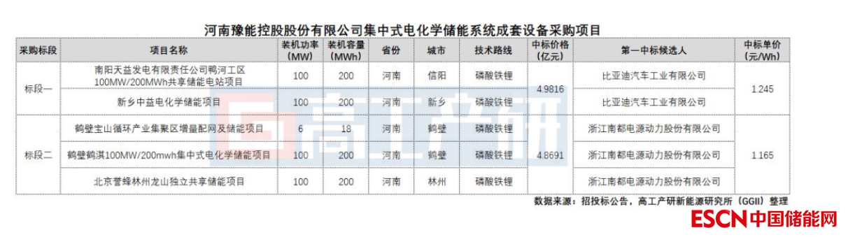 其中,河南省項(xiàng)目主要是河南豫能控股股份有限公司發(fā)布集中式電化學(xué)儲(chǔ)能系統(tǒng)成套設(shè)備采購中標(biāo)項(xiàng)目。該中標(biāo)項(xiàng)目涉及包含5個(gè)集中式電化學(xué)儲(chǔ)能系統(tǒng)成套設(shè)備采購,儲(chǔ)能總規(guī)模406MW/818MWh,項(xiàng)目地點(diǎn)位于鶴壁、新鄉(xiāng)、南陽、林州四市。該項(xiàng)目一標(biāo)段第一中標(biāo)候選人為比亞迪汽車工業(yè)有限公司,中標(biāo)報(bào)價(jià)49816萬元,中標(biāo)單價(jià)單價(jià)1.245元/Wh;二標(biāo)段第一中標(biāo)候選人為浙江南都電源動(dòng)力股份有限公司,中標(biāo)報(bào)價(jià)48691萬元,折合單價(jià)1.165元/Wh。