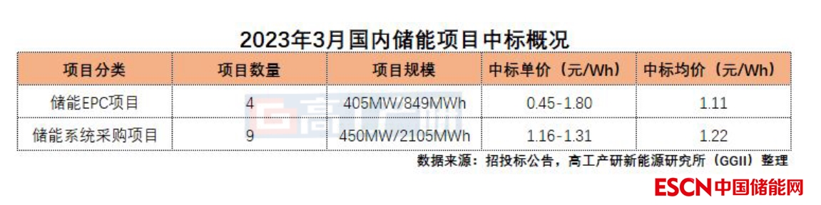 3月,國內(nèi)儲(chǔ)能項(xiàng)目EPC總承包報(bào)價(jià)在0.45-1.80元/Wh之間,均價(jià)為1.11元/Wh。本月儲(chǔ)能EPC中標(biāo)價(jià)最高的是華能辛店發(fā)電有限公司100兆瓦/200兆瓦時(shí)儲(chǔ)能項(xiàng)目,由北京海博思創(chuàng)科技股份有限公司中標(biāo),單價(jià)約為1.80元/Wh。