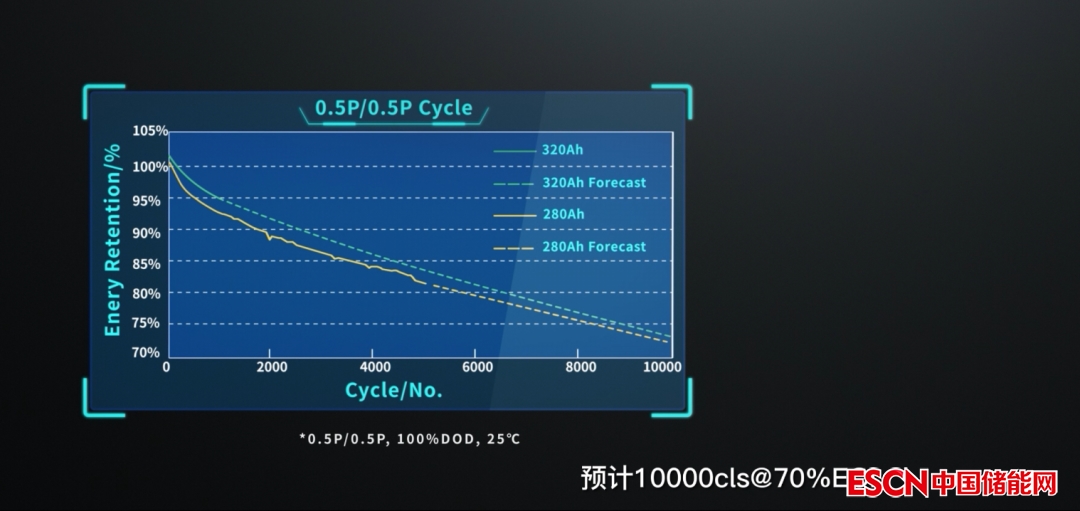 海辰儲能認為,提高儲能電池容量的核心在于提升活性物質(zhì)占比和穩(wěn)定性。為了保證電池循環(huán)壽命,海辰儲能采用高浸潤、高電導(dǎo)率電解液等技術(shù),保證初始及循環(huán)過程極片可靠性;采用蛛網(wǎng)型結(jié)構(gòu)粘結(jié)主材物質(zhì),提高老化過程極片穩(wěn)定性;沿用已有產(chǎn)品SEI膜穩(wěn)定技術(shù)元素,并進行升級優(yōu)化,保證320Ah循環(huán)性能。