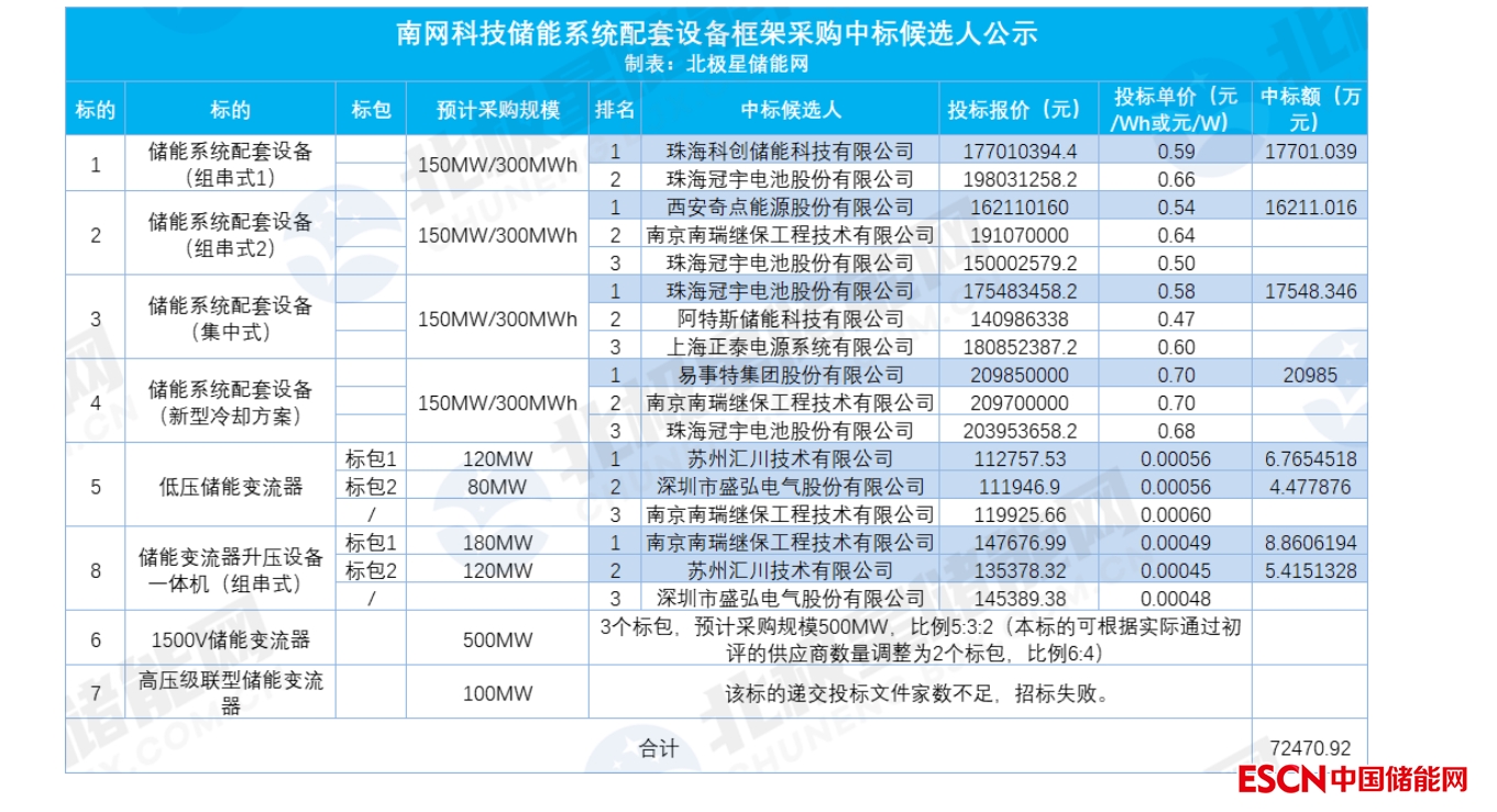 中國儲能網(wǎng)訊:4月14日,南方電網(wǎng)電力科技股份有限公司的儲能系統(tǒng)配套設(shè)備框架采購中標候選人公示。共有9家企業(yè)入圍中標候選人名單,七家企業(yè)預(yù)中標,中標總額約7.25億元!
