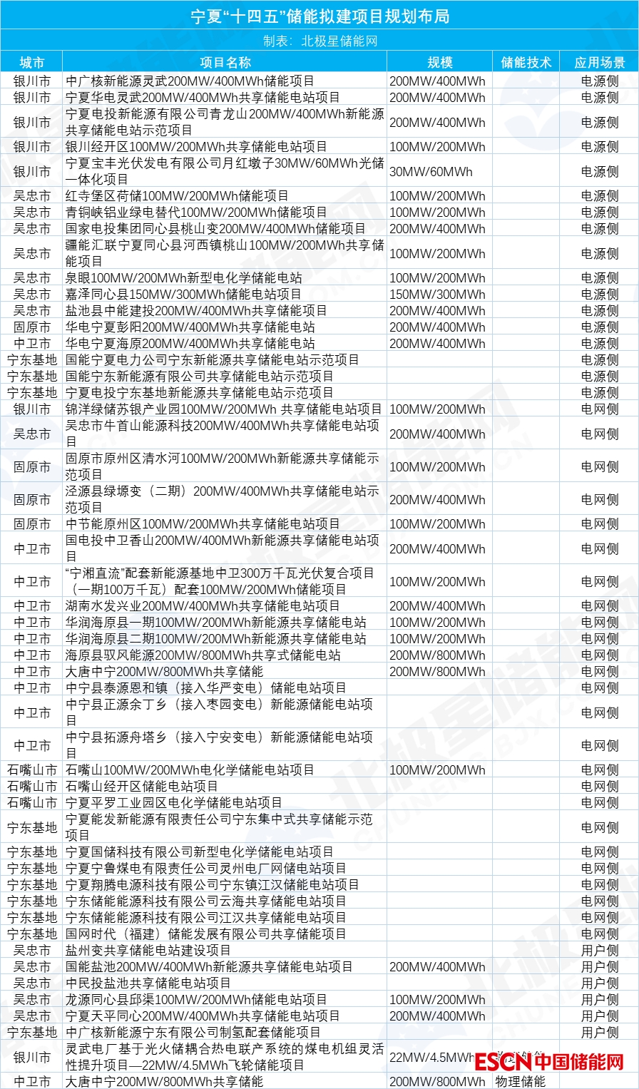 根據(jù)分區(qū)布局建議,十四五期間寧夏擬建50個(gè)電源側(cè)、電網(wǎng)側(cè)、用戶側(cè)以及物理儲(chǔ)能項(xiàng)目等各類項(xiàng)目,在6地市規(guī)劃的儲(chǔ)能規(guī)模力爭達(dá)到5.45GW。