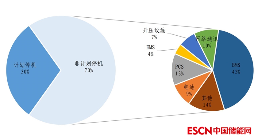 三是關鍵產(chǎn)品質量有待加強。雖然2022年電化學儲能平均轉換效率為81.06%,但是各地、各企業(yè)間差距較大,最高為92.51%,最低為33.91%,從投運時間段來看,投產(chǎn)1年內的平均轉換效率為80.53%,5年以上的平均轉換效率為60.86%,反映出電池產(chǎn)品整體質量還不十分成熟穩(wěn)定。2022年,全年非計劃停運671次,單位能量非計劃停運次數(shù)為24.45次/100MWh,相比2022年火電機組的非計劃停運次數(shù)0.35次/(臺?年),差距較大。電池管理系統(tǒng)(BMS)異常是電化學儲能電站非計劃停運的主要原因,停運次數(shù)占比43%,儲能變流器(PCS)、電池等電站關鍵設備異常導致的非計劃停運,單次平均停運時長最長,分別為60.98h、55.74h。